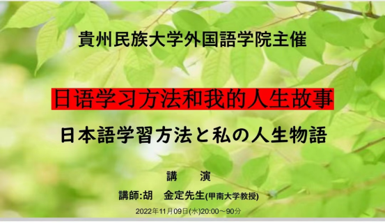 11月9日晚上,广发网页版邀请日本甲南大学胡金定教授为广发网页版日语系学子作了一场题为《日语学习方法和我的人生故事》的线上讲座。日语系主任李海博士主持会议,日语系全体学生前往学术报告厅聆听了该讲座。