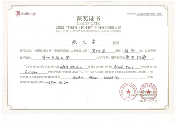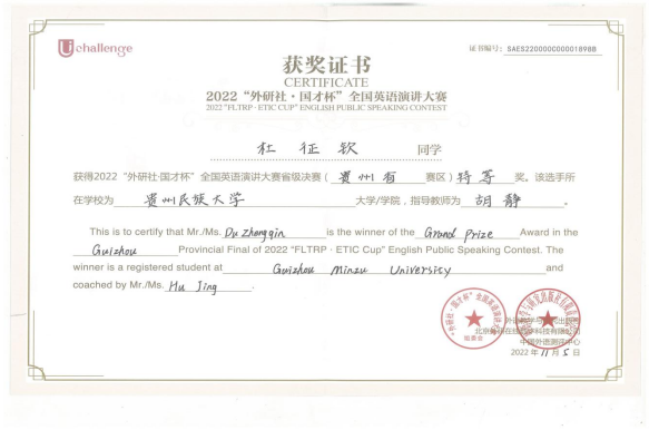 2022年11月5日“外研社·国才杯”英语演讲大赛贵州省赛区决赛在贵州师范学院举行,贵州民族大学选手在广发网页版教师胡静、龚坤的指导下喜获佳绩:杜征钦和张文卓从49名决赛选手中脱颖而出,摘取冠军和季军,均获省级特等奖,成功晋级全国总决赛!
