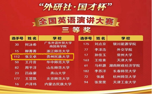 “外研社·国才杯”英语演讲大赛是外语类列入中国高等教育学会高校竞赛排行榜首位的比赛。日前贵州民族大学2020级英语专业的杜征钦同学和2020级法学专业的张文卓同学双双荣获2022年“外研社·国才杯”英语演讲大赛全国总决赛三等奖!